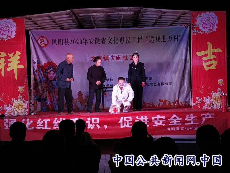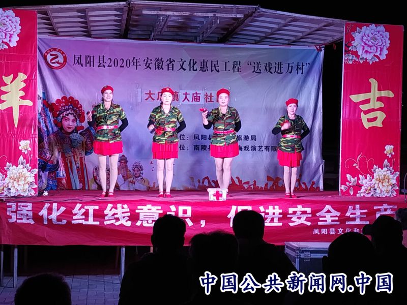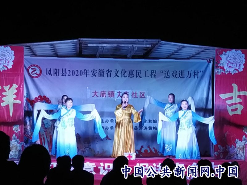 公共讯(田益全)10月9日晚,安徽凤阳县大庙镇新时代文明实践广场华灯璀璨、晚风轻拂、乐曲飞扬、歌声嘹亮。凤阳县2020年安徽省文化惠民工程“送戏进万村”走进大庙镇文艺演出活动正在这里举行。