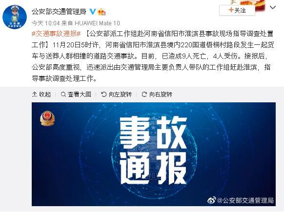 【公安部派工作组赴河南省信阳市淮滨县事故现场指导调查处置工作】11月20日5时许,河南省信阳市淮滨县境内220国道梧桐村路段发生一起货车与送葬人群相撞的道路交通事故。目前,已造成9人死亡,4人受伤。接报后,公安部高度重视,迅速派出由交通管理局主要负责人带队的工作组赶赴淮滨,指导事故调查处理工作。