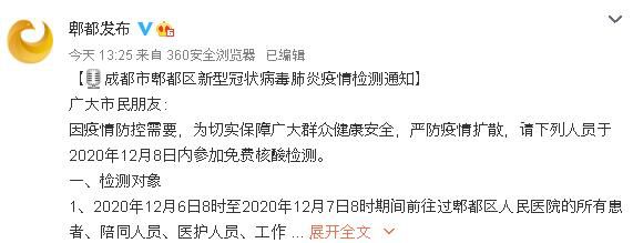 公共讯 据成都市郫都区官方微博消息,成都市郫都区新冠肺炎疫情防控指挥部7日发布疫情检测通知:因疫情防控需要,为切实保障广大群众健康安全,严防疫情扩散,请12月6日8时至12月7日8时期间前往过郫都区人民医院的所有患者、陪同人员、医护人员、工作人员,11月23日至12月7日到过郫筒街道太平村11组的人员,于12月8日内参加核酸检测。
