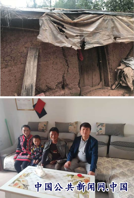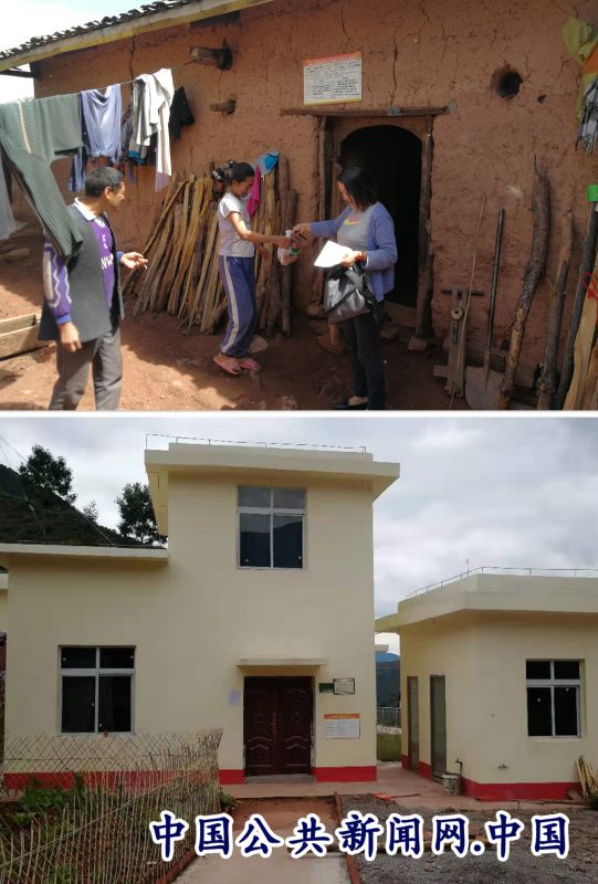 拼版图:上图为村民吉布研坡家老房子,下图为吉布研坡一家住进新房子。下图右一为喜德法院驻正洛村工作队队员孙皓。