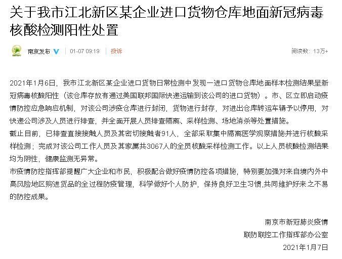 1月7日,南京市新冠肺炎疫情联防联控工作指挥部办公室发布消息,​​2021年1月6日,我市江北新区某企业进口货物日常检测中发现一进口货物仓库地面样本检测结果呈新冠病毒核酸阳性(该仓库存放有通过美国联邦国际快递运输到该公司的进口货物)。市、区立即启动疫情防控应急响应机制,对该公司涉疫仓库进行封闭,货物进行封存,对进出仓库转运车辆予以停用,对快递公司涉及人员进行排查,并全面开展人员排查隔离、采样检测、场地消杀等处置措施。