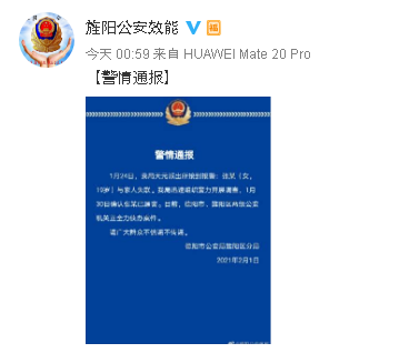 法治讯 四川省德阳市公安局旌阳区分局官方微博@旌阳公安效能 2月1日凌晨发布警情通报称,1月24日接到报警:一19岁女子与家人失联。1月30日确认上述女子已遇害。目前,德阳市、旌阳区两级公安机关正全力侦办案件。