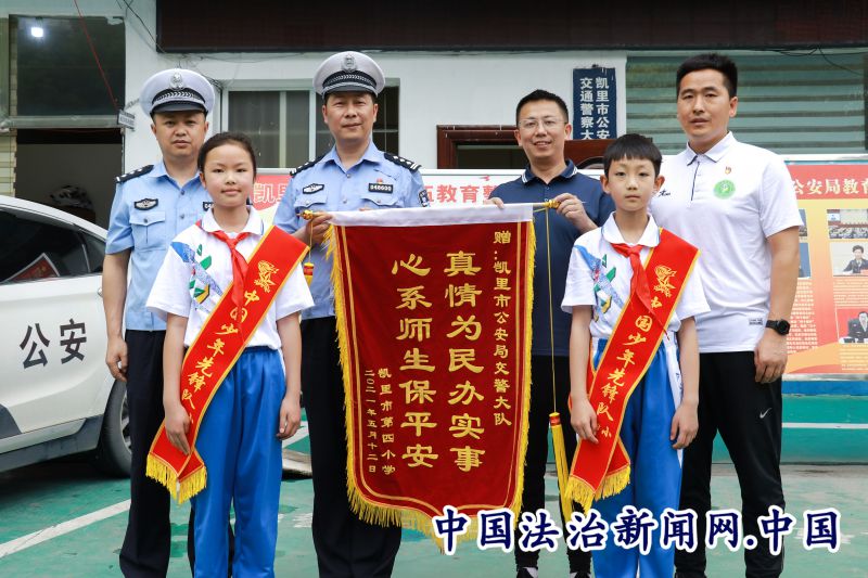 法治讯(陈世波)“我为群众办实事”实践活动开展以来,凯里市公安局交警大队全面夯实校园周边交通管理举措,全力维护学校师生交通安全。5月12日上午,凯里市第四小学金溪巷校区向凯里交警赠送了一面“真情为民办实事 · 心系师生保平安“字样的锦旗。