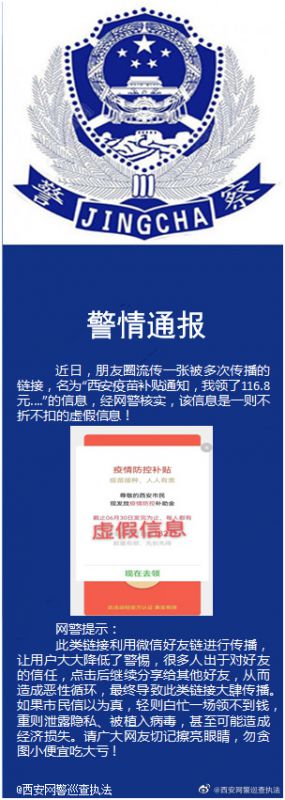 据西安市公安局网络安全保卫支队官方微博消息,近日,朋友圈流传一条已被多次转发的链接,点开后名为“西安疫苗补贴通知,我领了116.8元……”的信息,经网警核实,该信息是一则不折不扣的虚假信息。警方提醒广大网友切忌贪图小利而被不法分子利用,最终受伤害的是自己。