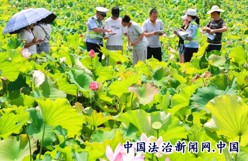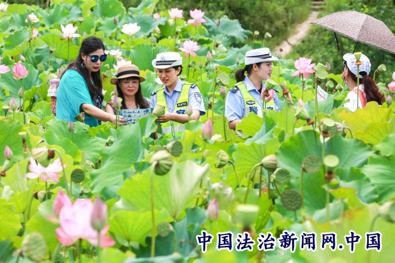 法治讯(唐光新/文 周国辉/图)时下,正进入“赏花季”,各景区景点踏青赏花游人如织。7月24日,贵州省凯里市公安局交警大队巧借“赏花季”搭建交通安全宣传舞台,组织宣传民警、辅警走进炉山镇荷花池景点对游客进行交通安全知识宣传,奉上“赏花季”交通安全提示,交警成为花丛中一道靓丽风景……